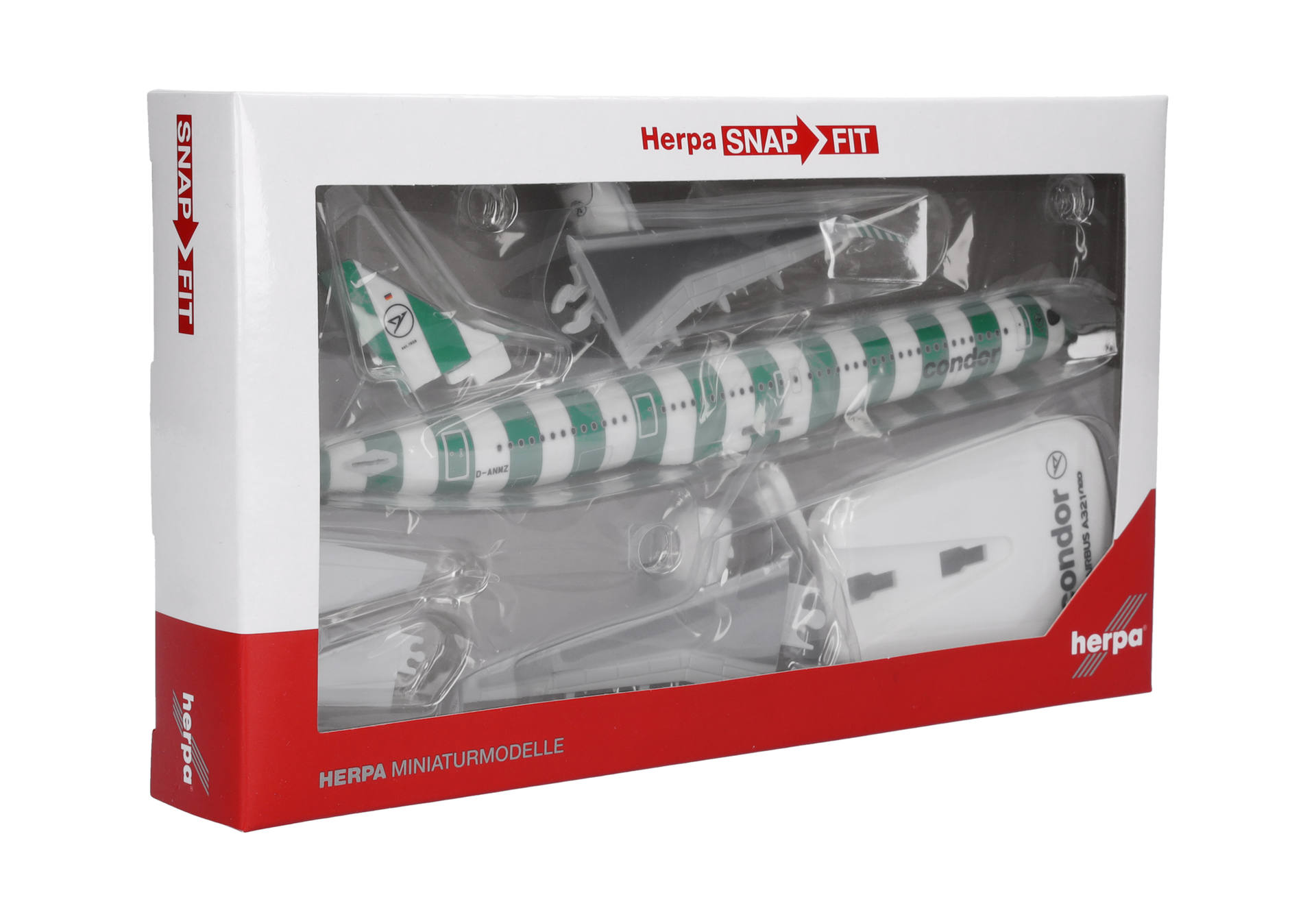 With a large order of no fewer than 28 Airbus A321neo aircraft, the German leisure airline is modernizing its short- and medium-haul fleet. The new aircraft will replace older A321s and the few remaining Boeing 757-300s. The first aircraft, painted with stripes in "island green", was delivered to Condor in June 2024. Herpa SnapFit models shine with an unbeatable value for money. They come with a display stand and can be assembled in a few simple steps without the need for glue or other tools.