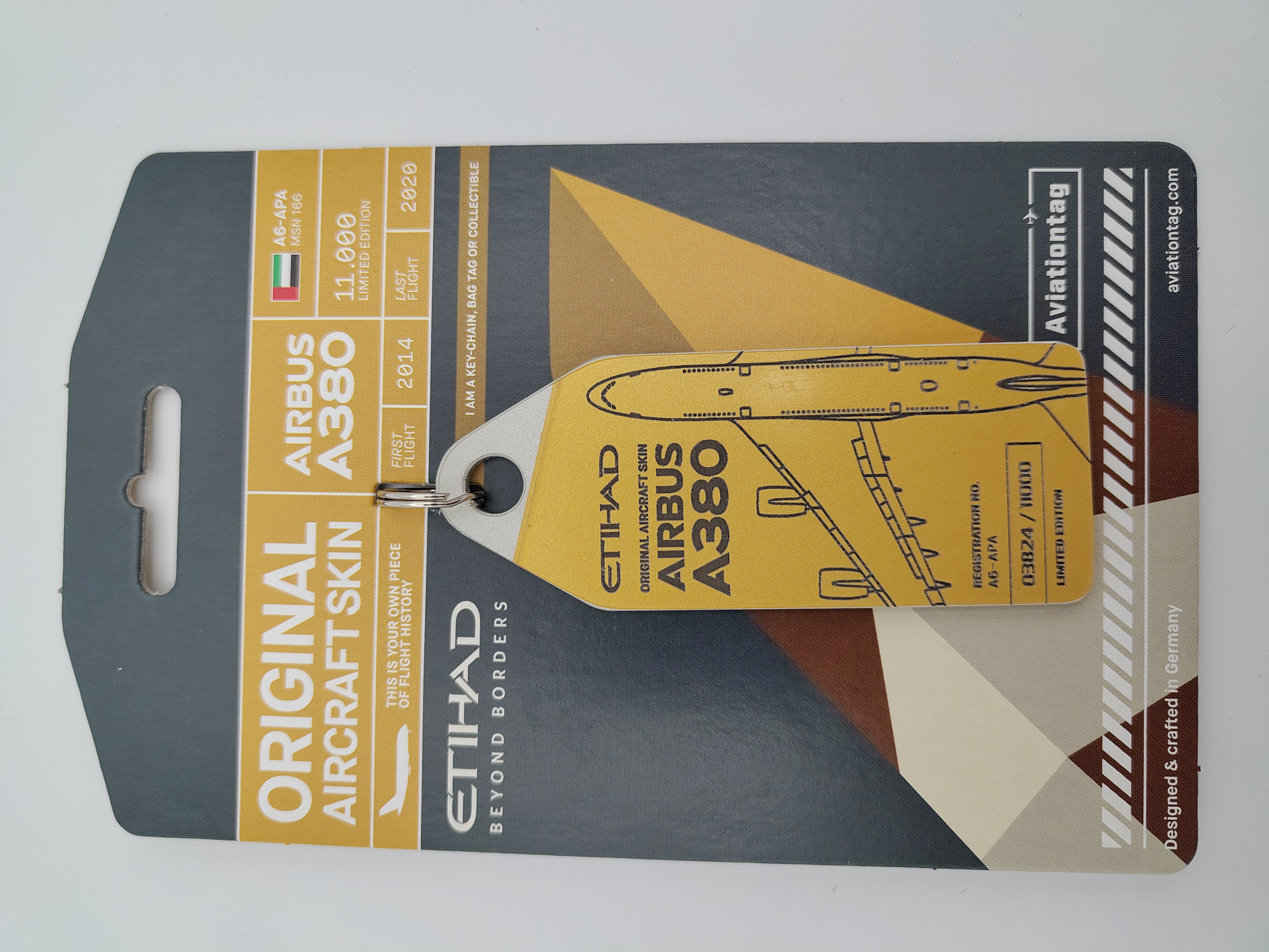 Made from original GLARE material from Etihad's first Airbus A380, A6-APA, this edition highlights one of the most advanced materials in civil aviation. GLARE — a glass fiber reinforced aluminum laminate — is significantly thicker than traditional aircraft skin. The visible layer edges make the complex structure immediately recognizable.